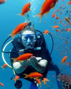 Далее вас ожидает увлекательное погружение с аквалангом. Опытный инструктор проведёт инструктаж перед дайвингом, объяснит основные правила и поможет вам почувствовать себя уверенно под водой. Главное — сохранять спокойствие и довериться профессионалу!